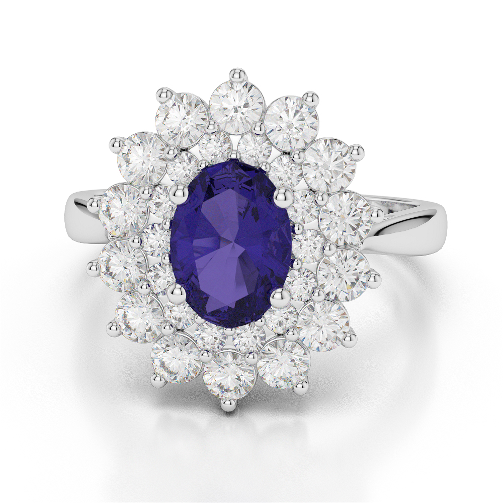 This elegant oval tanzanite and diamond ring is a statement piece, surrounded by a double halo of sparkling diamonds, showcasing precision and attention to detail.