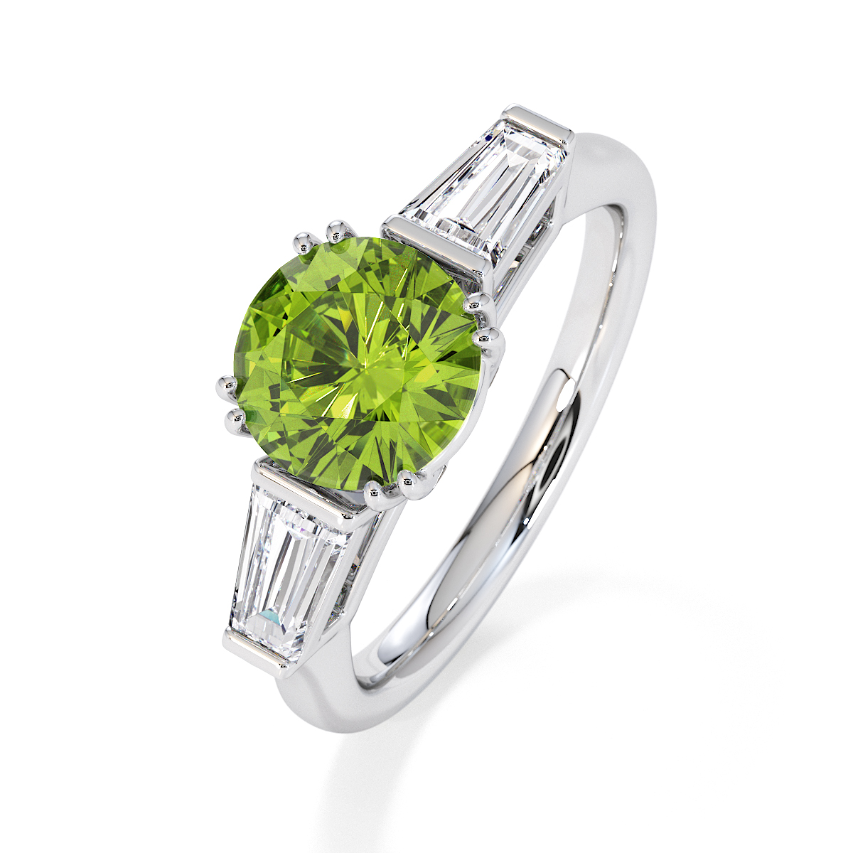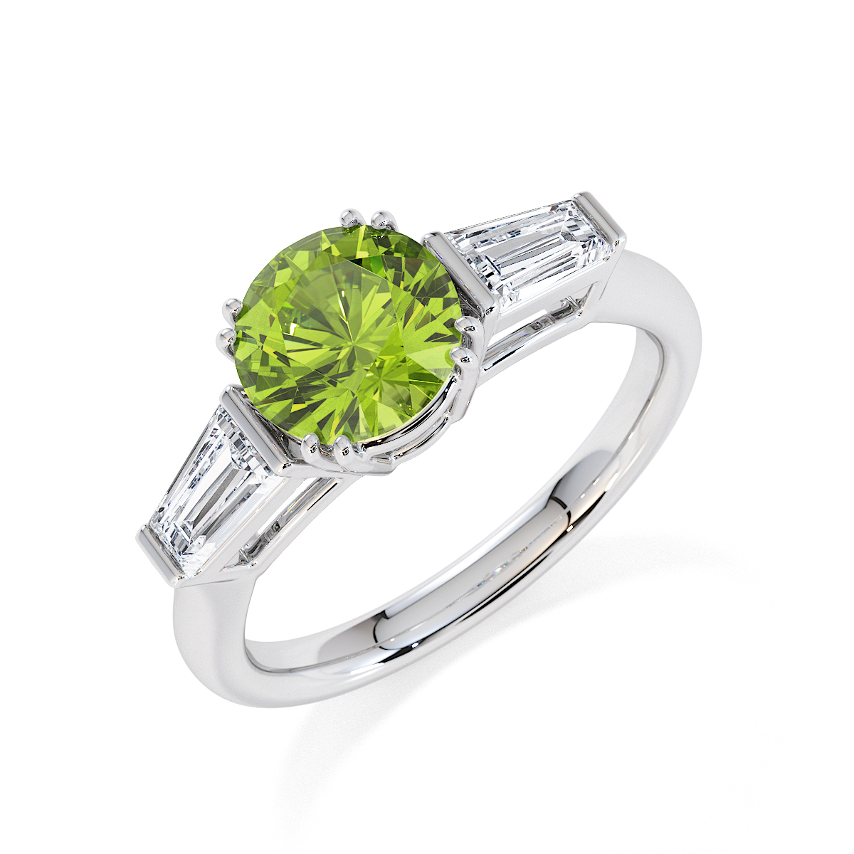 Introducing our exquisite round cut Peridot and Diamond Engagement Ring, adorned with tapered baguette side stones delicately prong-set.
