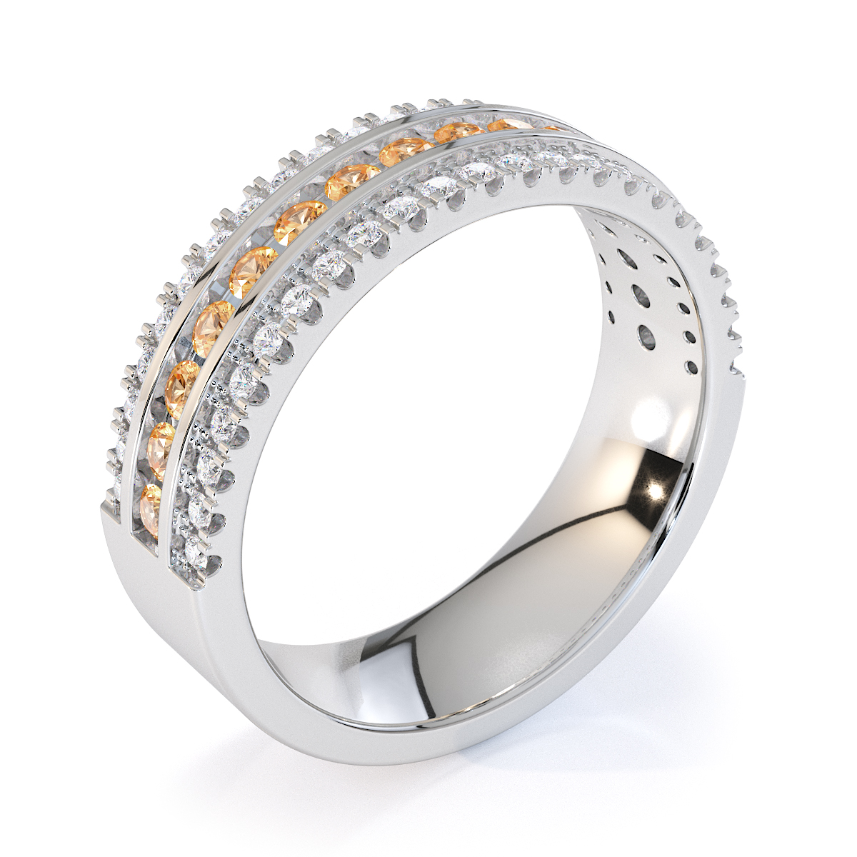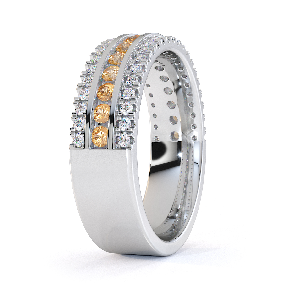 This eternity ring features citrines and diamonds, showcasing elegance and sophistication. It is a half-eternity ring with both split prong and channel settings, ensuring maximum security. The regal charm of the citrines and the radiant sparkle of the diamonds make it a symbol of commitment and style.
