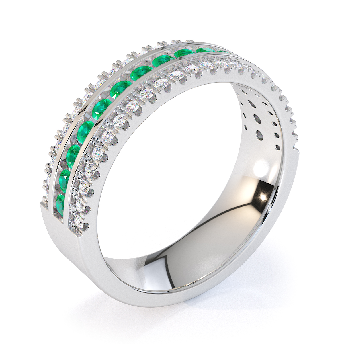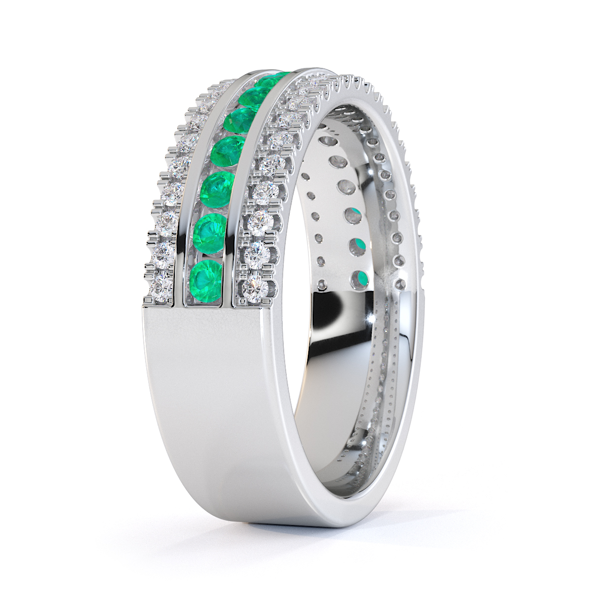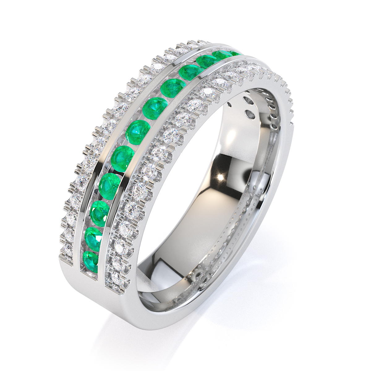 This eternity ring features emeralds and diamonds, showcasing elegance and sophistication. It is a half-eternity ring with both split prong and channel settings, ensuring maximum security. The regal charm of the emeralds and the radiant sparkle of the diamonds make it a symbol of commitment and style.