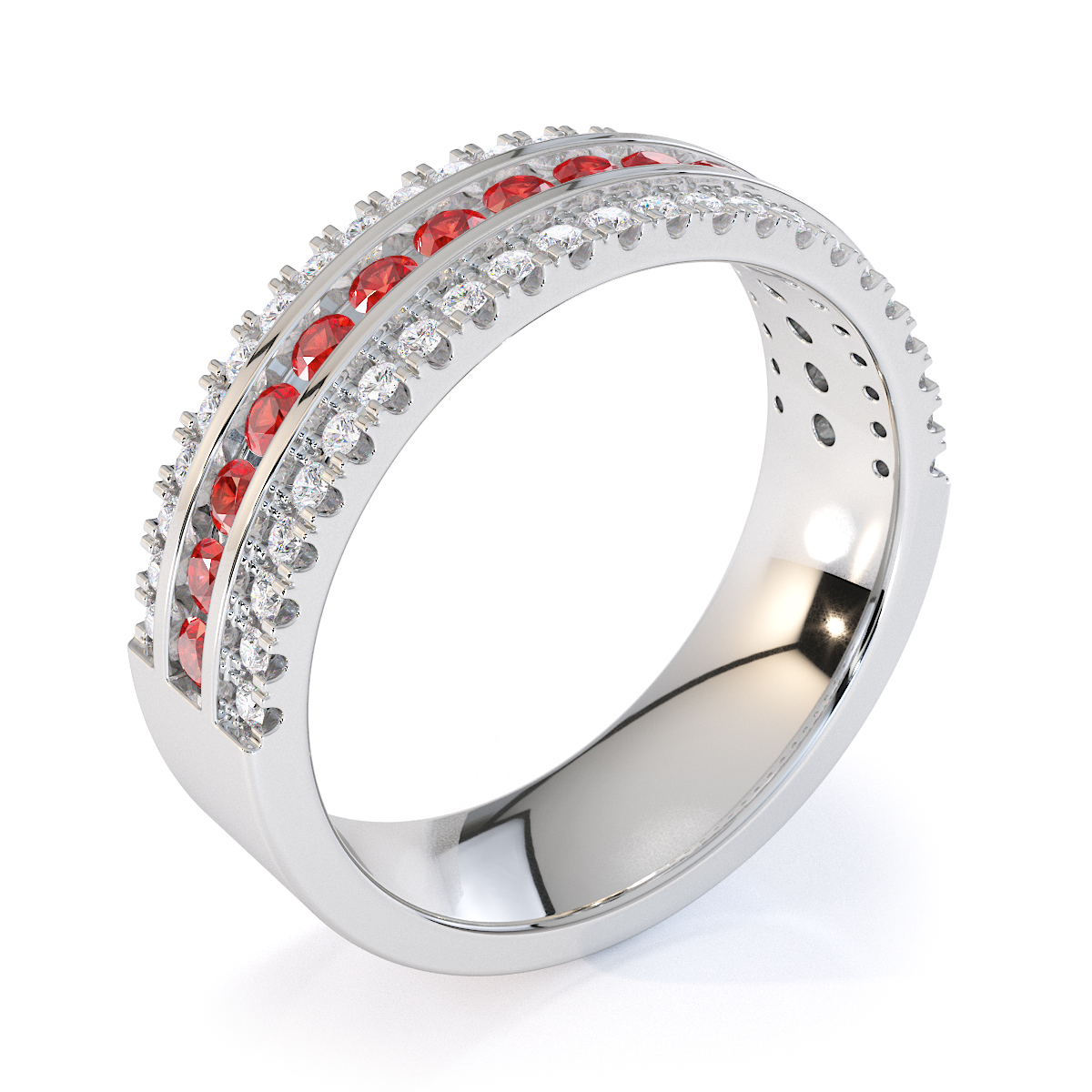 This eternity ring features garnets and diamonds, showcasing elegance and sophistication. It is a half-eternity ring with both split prong and channel settings, ensuring maximum security. The regal charm of the garnets and the radiant sparkle of the diamonds make it a symbol of commitment and style.