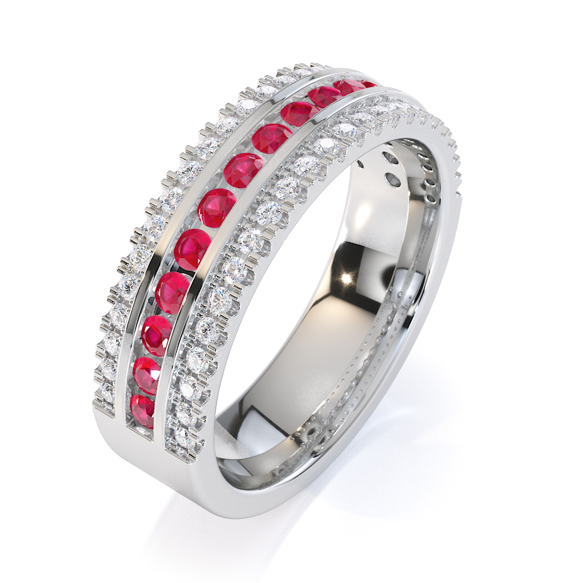 This eternity ring features rubies and diamonds, showcasing elegance and sophistication. It is a half-eternity ring with both split prong and channel settings, ensuring maximum security. The regal charm of the rubies and the radiant sparkle of the diamonds make it a symbol of commitment and style.
