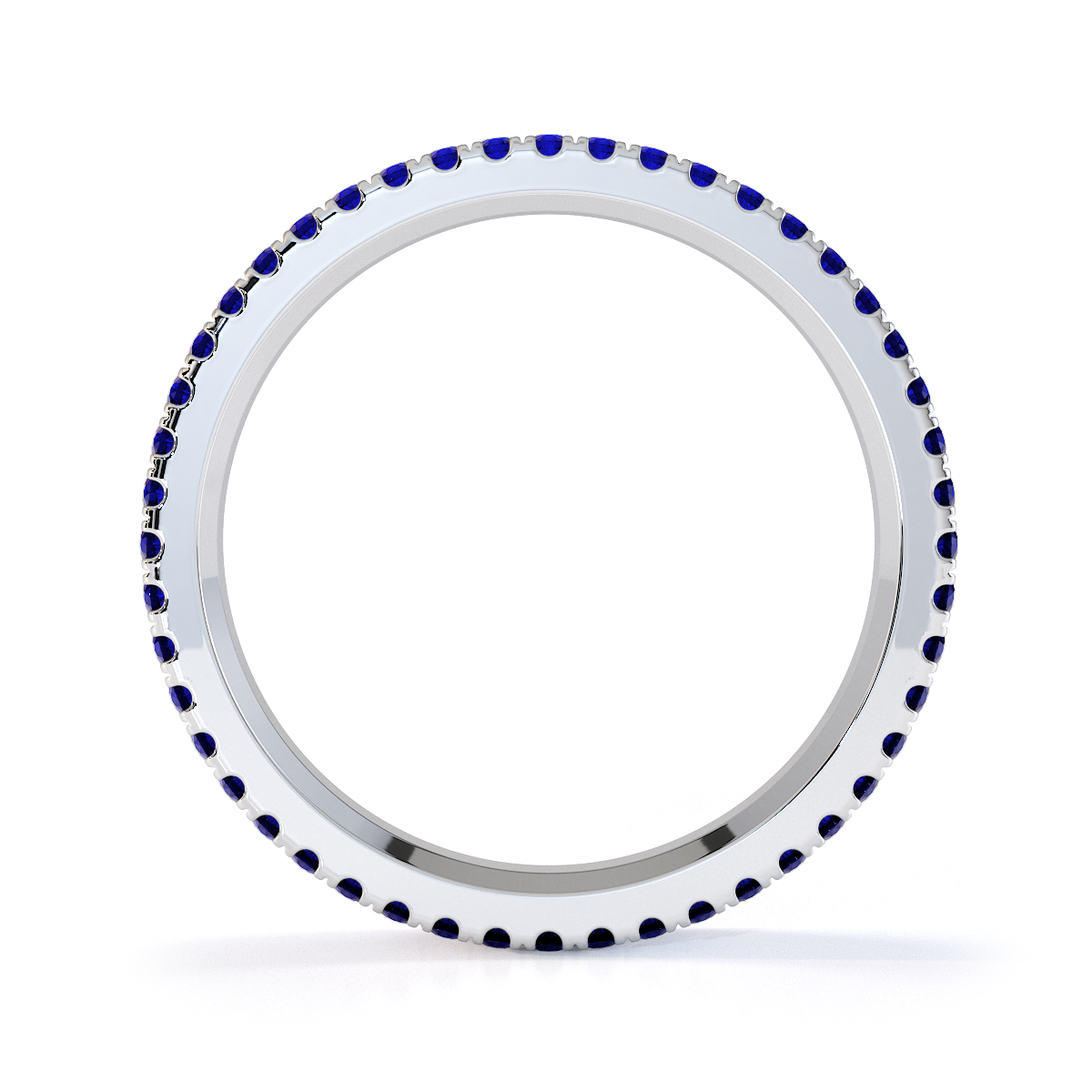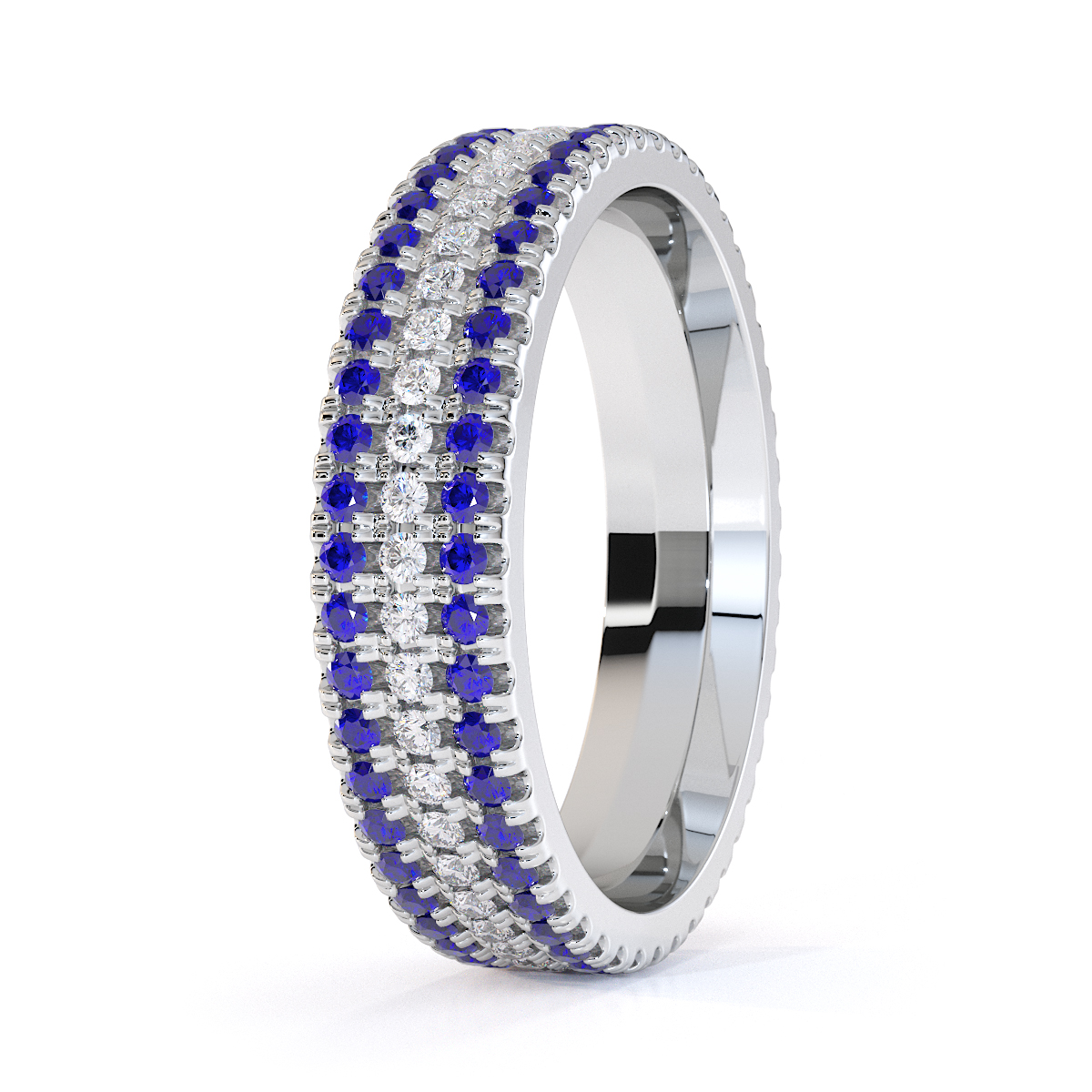 Our eternity ring is a symbol of love and commitment, featuring a full-eternity design with blue sapphires and diamonds. The split prong setting enhances the brilliance of each gemstone, creating a mesmerising sparkle. Crafted with precision, this timeless and elegant choice is perfect for those seeking a touch of sophistication on their special day.